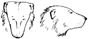 Существует и еще один тип голов, для которых характерна более или менее массивная черепная коробка, однако скулы порядочно уплощены. Морда недостаточно объемная у основания, спинка носа неширокая, подглазничная сфера заполнена слабо, а губы толстые, отвисают и образуют складки. При осмотре сверху голова не имеет формы клина, так как переход к лицевой части черепа чрезвычайно резкий. К сожалению, достаточно часто можно наблюдать собак, имеющих подобные недостатки в строении головы.